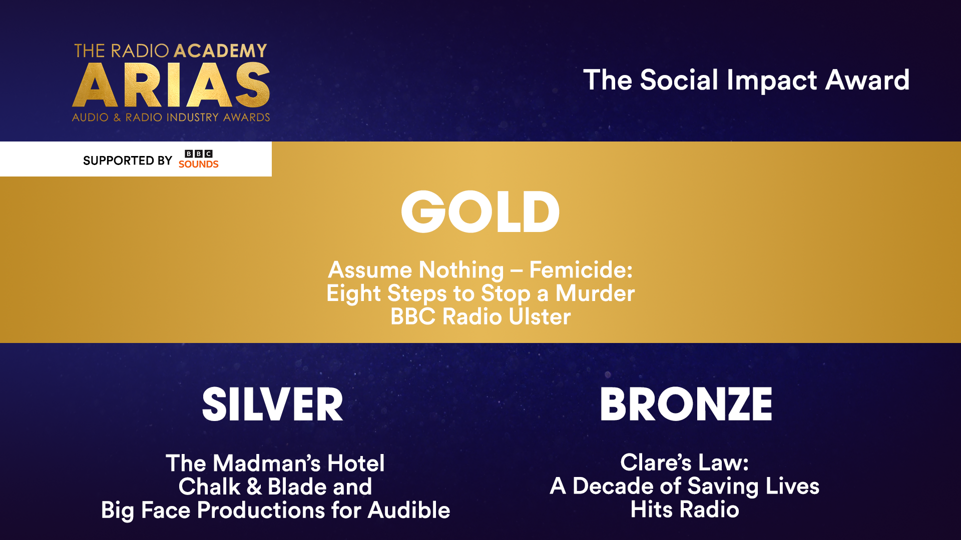 - GOLD: Assume Nothing – Femicide: Eight Steps to Stop a Murder – BBC Radio Ulster