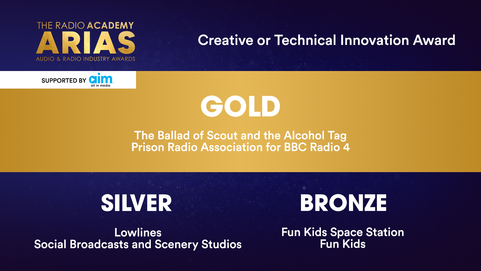 - GOLD: The Ballad of Scout and the Alcohol Tag – Prison Radio Association for BBC Radio 4