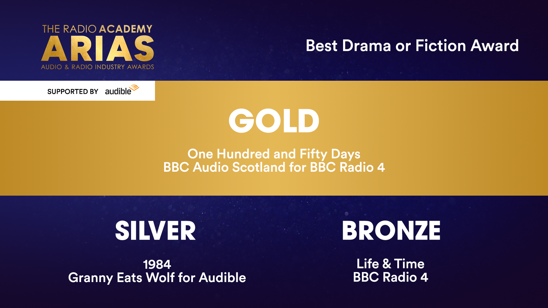 | Best Drama or Fiction Award 2025 Supported by Audible ● GOLD: One Hundred and Fifty Days – BBC Audio Scotland for BBC Radio 4 |