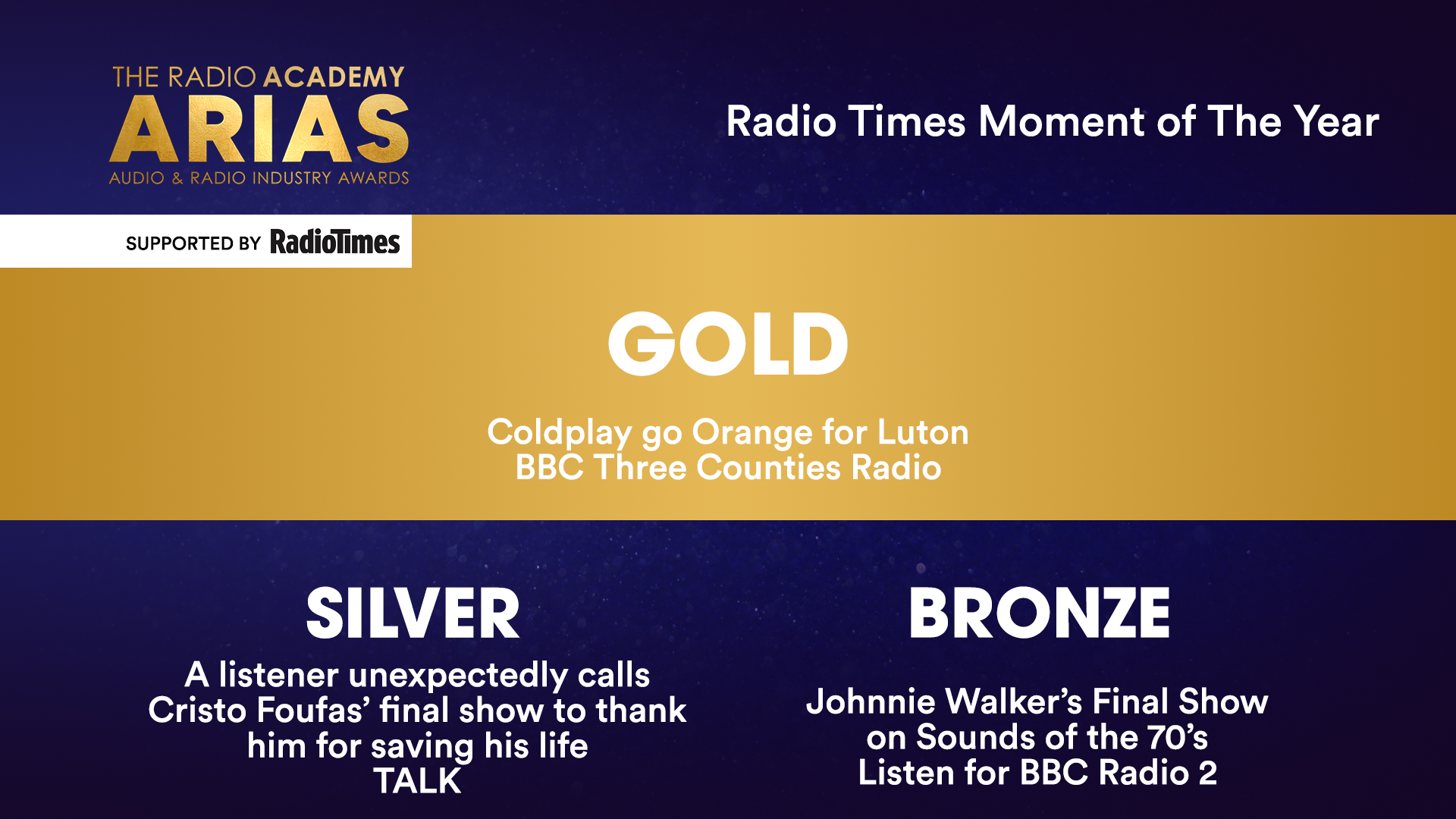 - BRONZE: Johnnie Walker’s Final Show on Sounds of the 70’s – Listen for BBC Radio 2