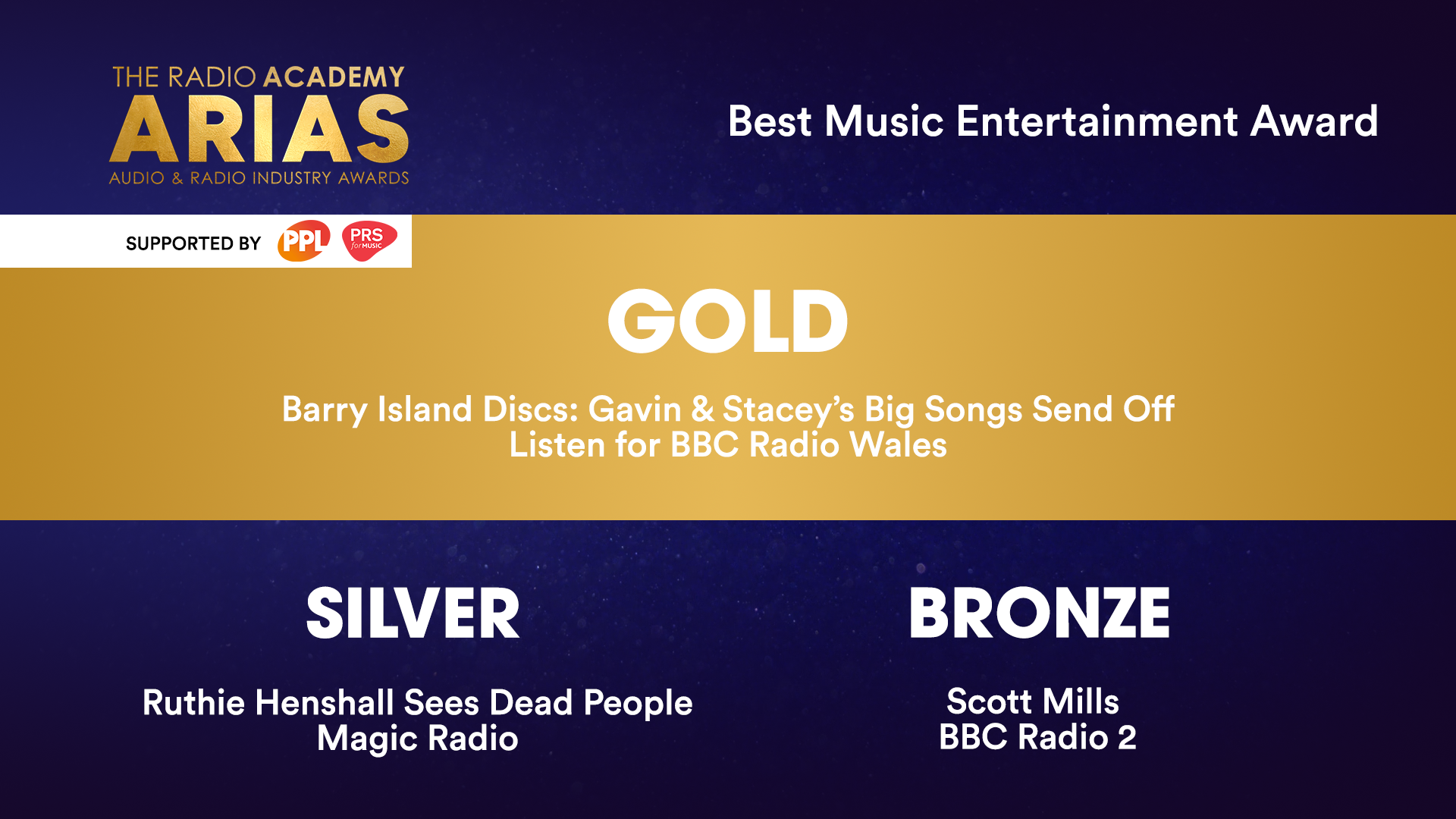 | Best Music Entertainment Award 2025 Supported by PPL & PRS For Music ● GOLD: Barry Island Discs: Gavin & Stacey’s Big Songs Send Off – Listen for BBC Radio Wales |